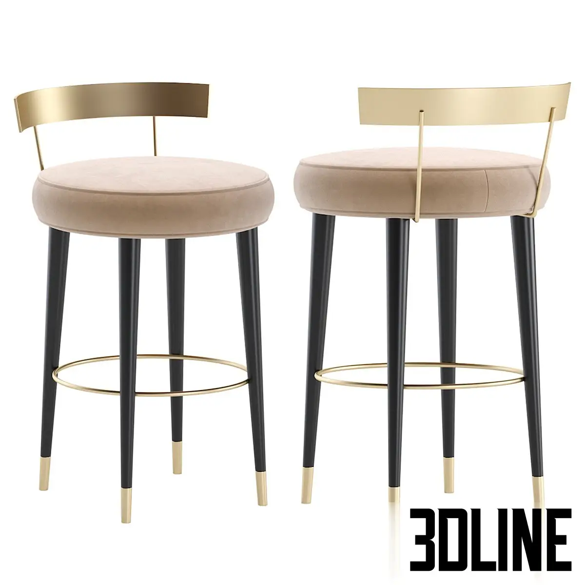 Inject a dose of Art Deco glamour into your kitchen island or bar area with the Cazarina San Trope Bar Stool 3D model. This chic piece features a plush, round velvet seat (available in white, teal, and beige) paired with a minimalist, curved brass backrest. The design is supported by sleek black tapered legs capped with elegant gold ferrules and connected by a gold footrest ring. It is an ideal choice for luxury residential or high-end commercial interiors.