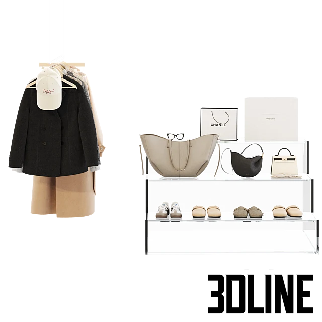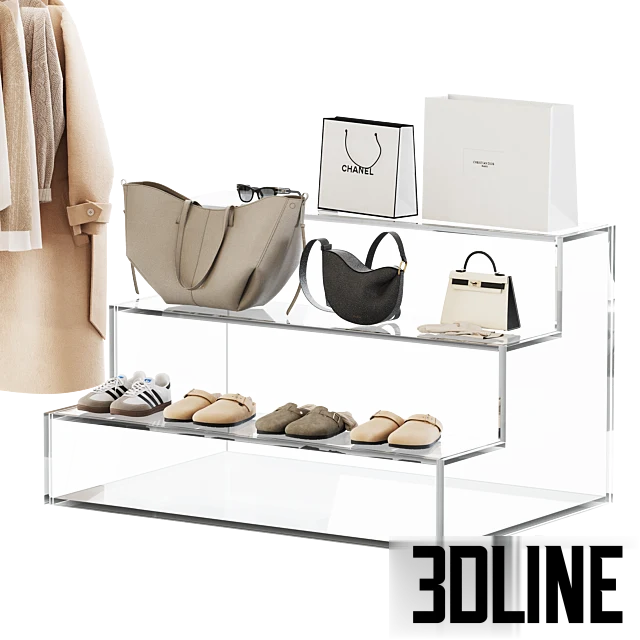 **Clothes hanger shop display 3d model:** Equip your retail store and luxury closet visualizations with this exclusive **clothes hanger shop display 3d model**. This **boutique retail merchandising set** includes high-detail folded garments on hangers, designer handbags, shopping bags, and a tiered **acrylic shoe display stand**, making it essential for visual merchandisers. The assets are perfect for achieving a realistic, fully styled retail environment.