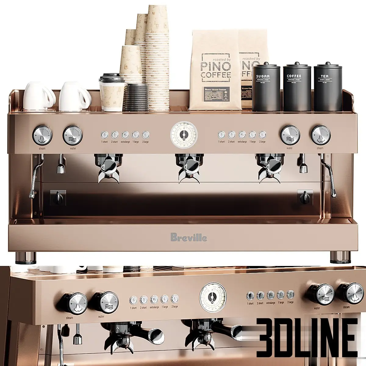 Equip your kitchen, cafe, or restaurant scenes with this extensive Coffee Bar Accessories Set 3D model. The centerpiece is a stunning, professional-grade espresso machine finished in a luxurious satin bronze/copper, paired with a matching high-end coffee grinder. The collection is fully propped with essential barista tools, including a pour-over carafe, stacked paper cups, bags of coffee beans, syrup dispensers, and a selection of liquor bottles and glassware for a complete beverage station.
