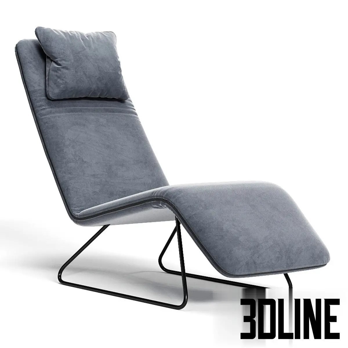 Incorporate Italian minimalism with the Colombini Casa Fergie Armchair 3D model. This piece functions as a hybrid between a lounge chair and a chaise longue, designed for relaxation with its reclined profile and included headrest pillow. The upholstered shell, rendered in a soft grey velvet or fabric, floats on a lightweight, architectural black metal wire base. It is a perfect accent piece for modern reading corners, solariums, or stylish living rooms.
