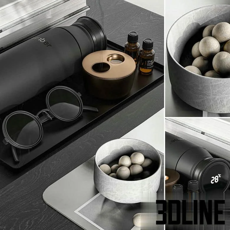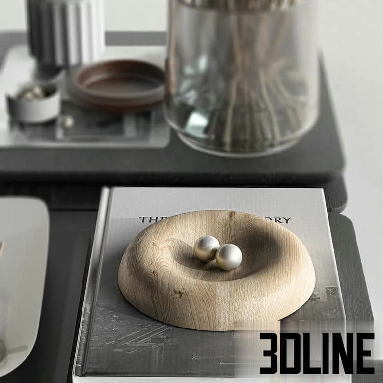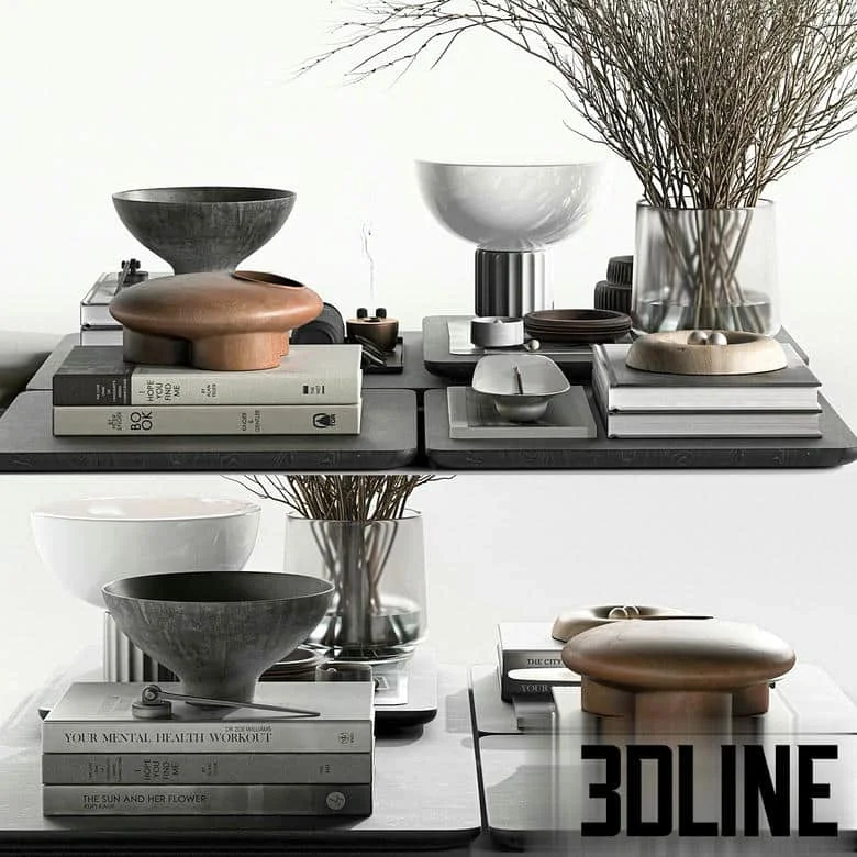 **Modern decorative set 3d model:** Finalize your contemporary interiors with this exclusive **modern decorative set 3d model** (Set 043). This **minimalist shelf styling** asset includes a sophisticated collection of objects: detailed books, ceramic bowls, a glass vase with dried branches, and wood accents, perfect for achieving a curated look. The set’s blend of materials makes it an ideal **multi-material table decor** solution.