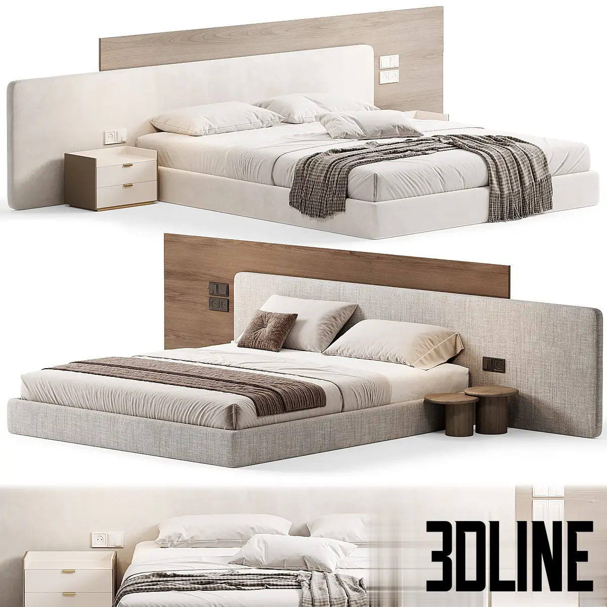 Furnish your luxury bedroom scenes with this versatile, high-detail 3D model set of a double bed (Bed 03). The bed features a striking, oversized headboard that combines a central wood veneer panel with surrounding upholstered fabric elements. The low frame is covered in a light texture, and the set includes two coordinating nightstands (one fabric/wood, one drawer unit) and detailed luxury bedding. This furniture is perfect for modern residential and hotel bedroom designs.