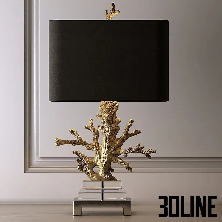 **Gold coral table lamp 3d model:** Add a touch of exotic luxury to your renders with this exclusive **gold coral table lamp 3d model**. This **luxury nautical lighting** fixture features a stunning sculpted coral base finished in polished brass, mounted on a clear acrylic plinth. The contrasting black shade ensures focused, elegant light casting. It’s a perfect **designer bedside accent light** for luxury coastal or contemporary interiors.