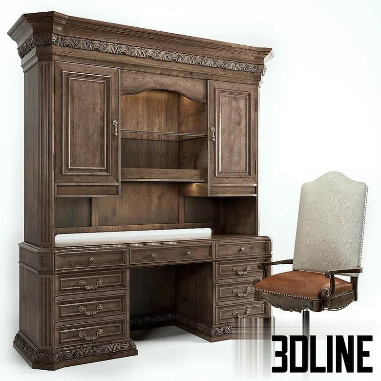 **Hooker Rhapsody office set 3d model:** Define opulence and grandeur in your commercial and residential visualizations with this exclusive **Hooker Rhapsody office set 3d model**. This **luxury classic executive desk** and hutch set features intricate wood carving, deep finishes, and ample storage, making it essential for designers specializing in traditional or neoclassical offices. The set includes a matching **traditional carved wood office furniture** armchair.
