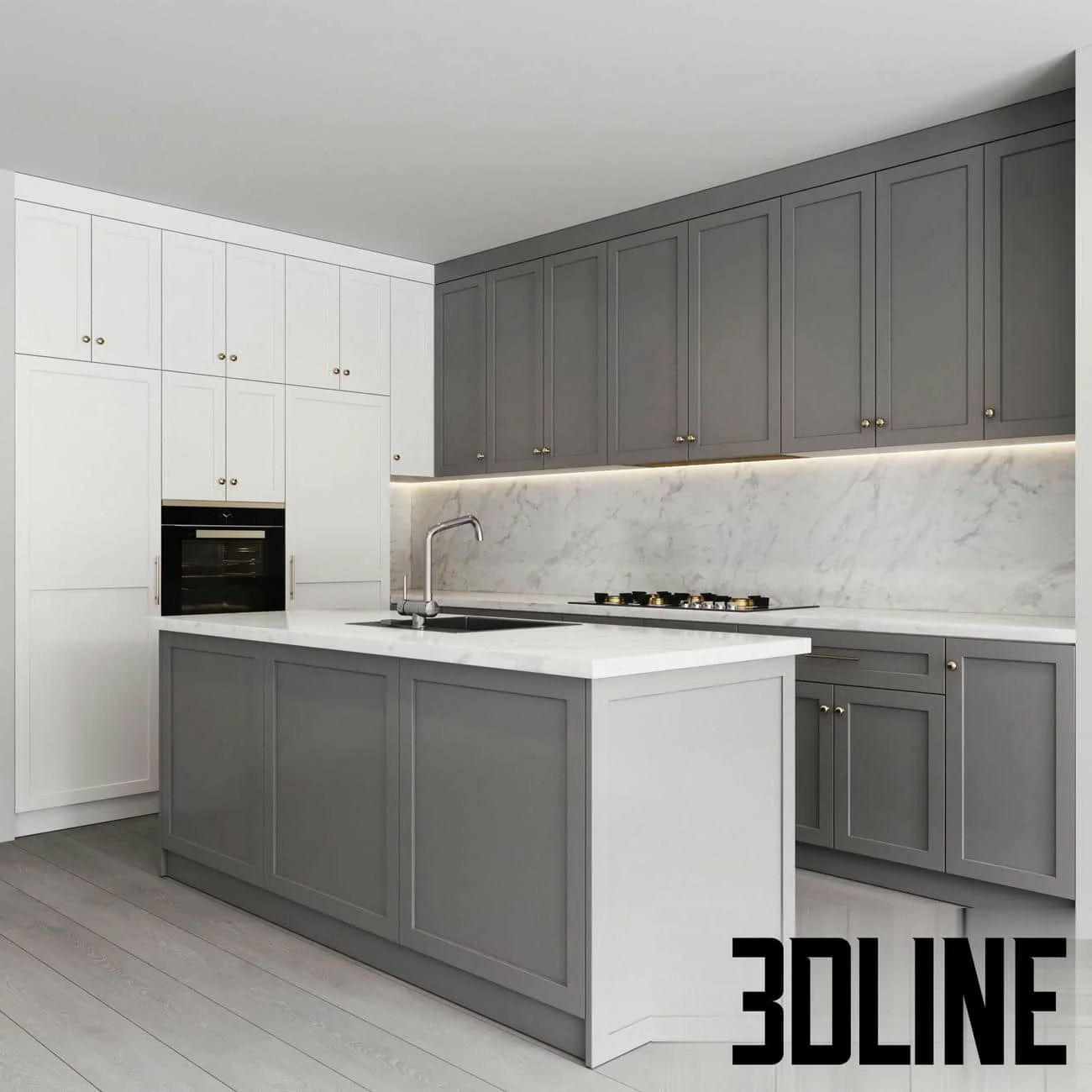 **Classic modern shaker kitchen 3d model:** Define timeless style in your kitchen visualizations with this exclusive **classic modern shaker kitchen 3d model** (Kitchen 036). This **grey and white cabinet design** features classic framed doors and contemporary metallic handles, contrasting beautifully with a high-detail **luxury marble backsplash kitchen** and a central island unit.