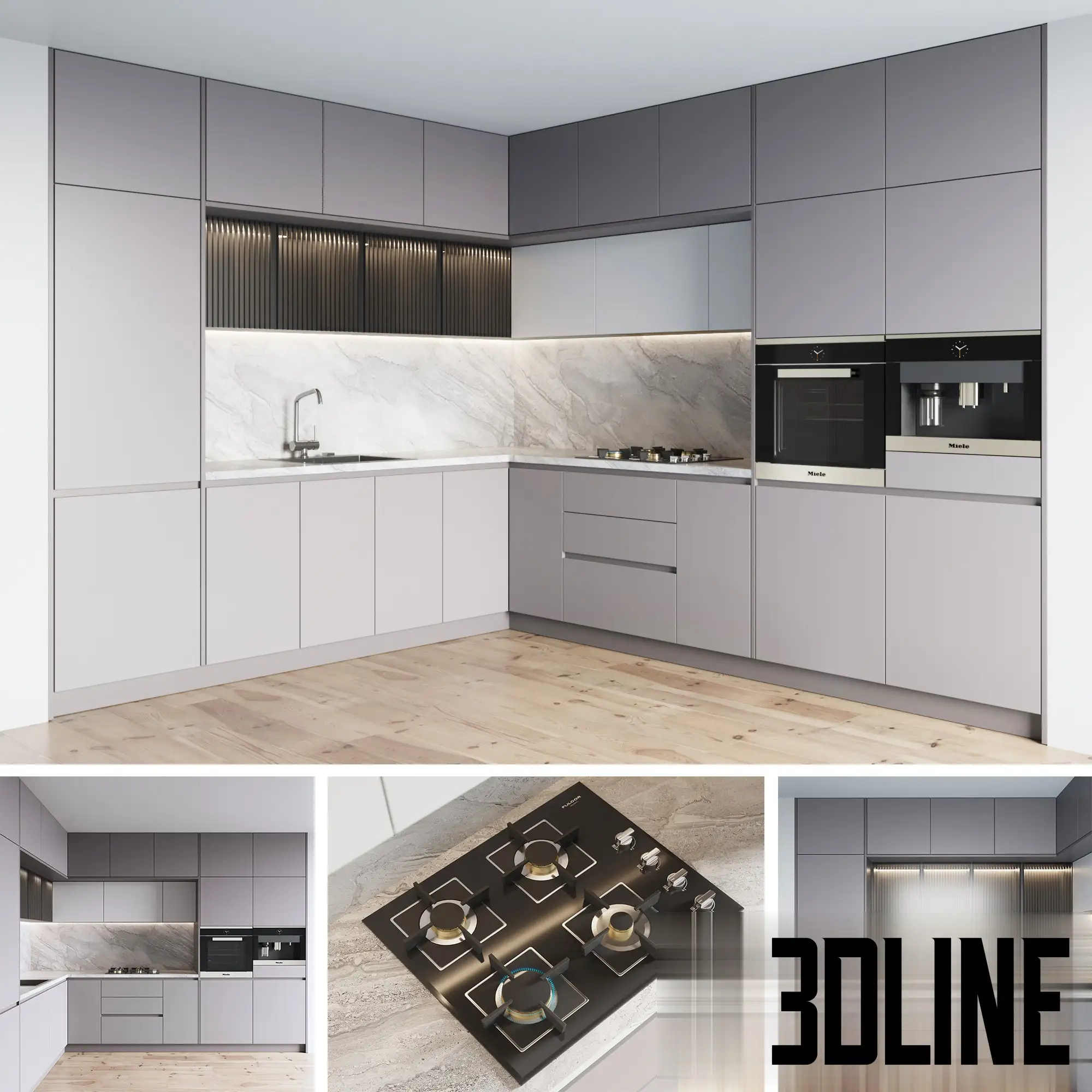 Streamline your interior visualizations with this comprehensive Modern Grey Kitchen 3D model. The design showcases a contemporary L-shaped layout with minimalist matte grey cabinetry and handleless facades. It features luxurious white marble stone for the backsplash and countertops, contrasted by a section of upper cabinets with ribbed/fluted glass and warm internal lighting. The scene is fully equipped with high-end built-in Miele appliances (oven and coffee machine), a gas cooktop, and a modern sink area.