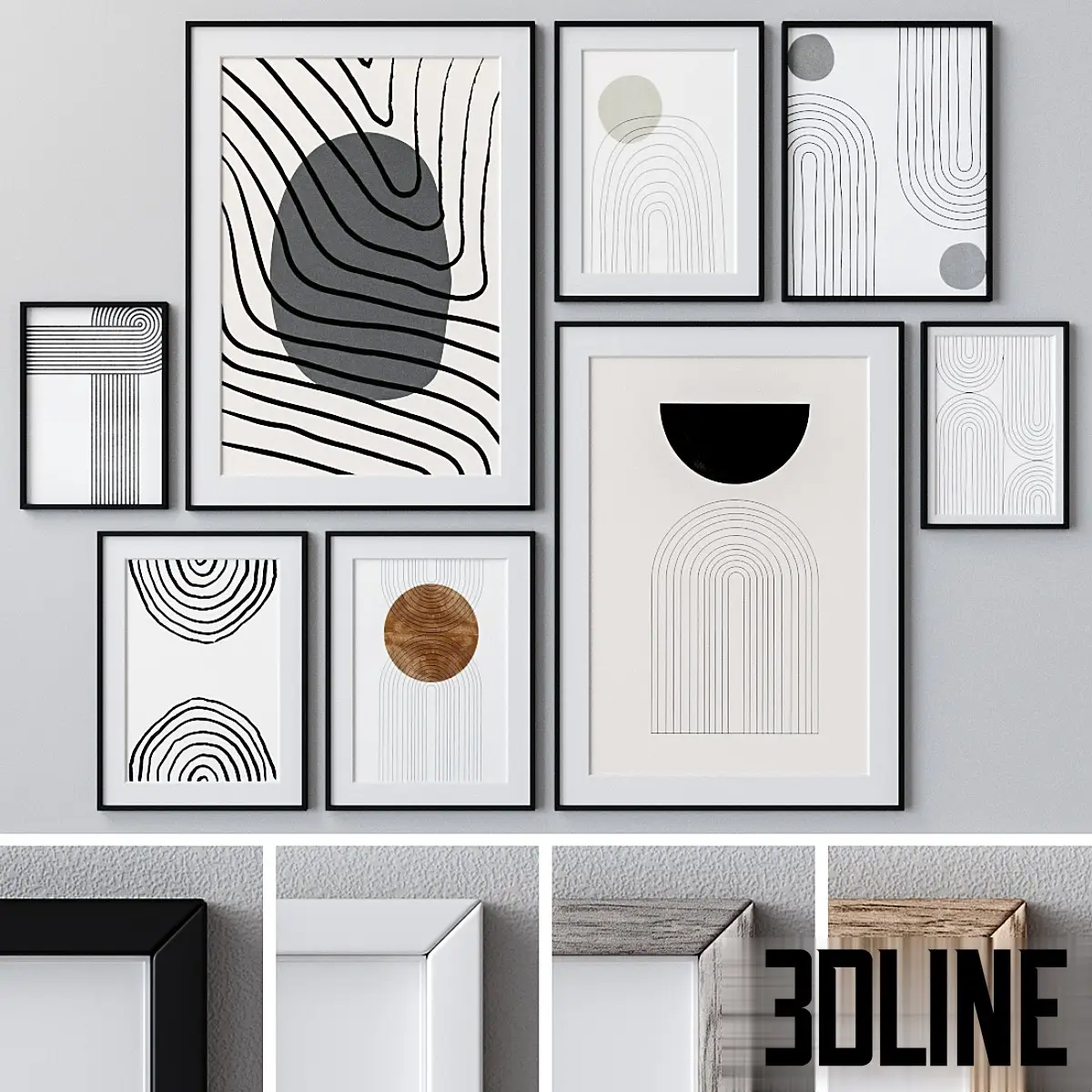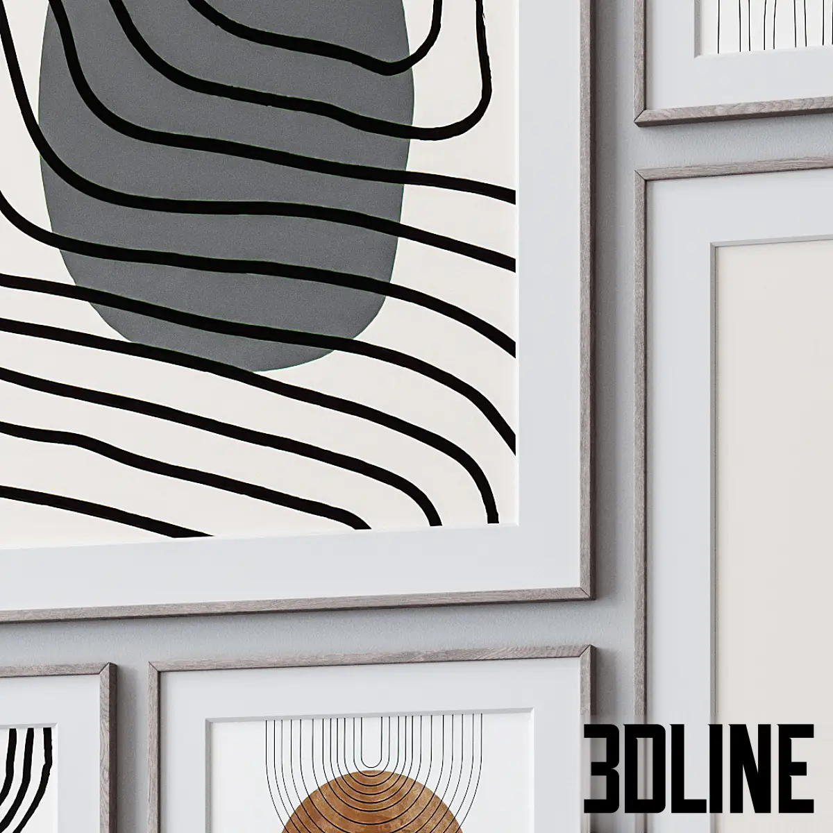 3D model set of gallery wall photo frames featuring abstract black and white line art and geometric shapes, available in black, white, and wood frame finishes.