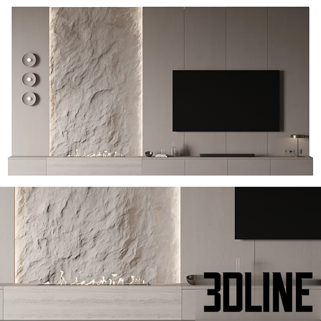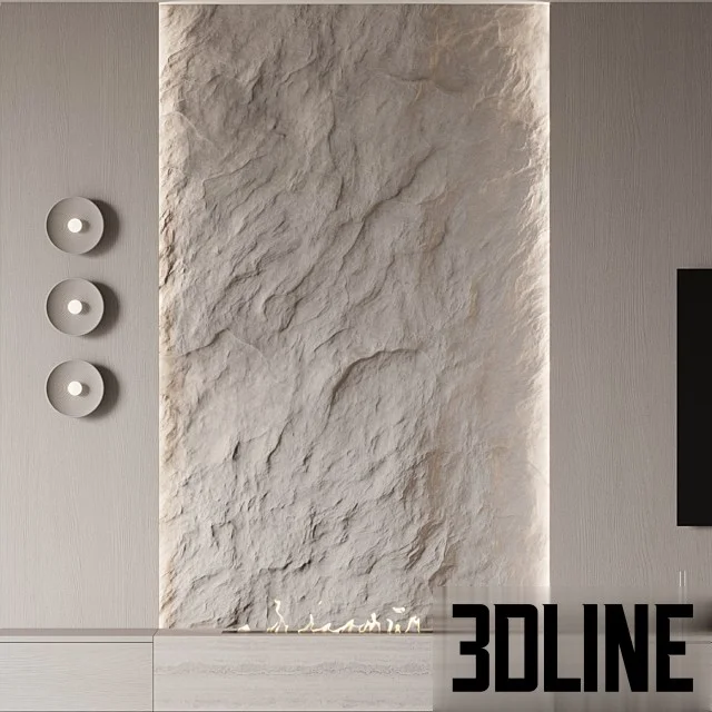 **TV wall panel stone texture 3d:** Create a dramatic focal point in your renders with this exclusive **TV wall panel stone texture 3d** model. This **luxury stone accent wall** features a highly detailed, rough natural stone texture, complete with subtle ambient LED lighting and an integrated bio-fireplace effect. The design is essential for architects and designers creating high-end **integrated fireplace media center** visualization.